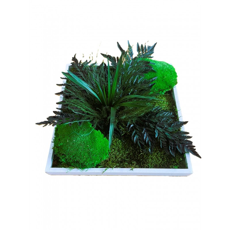 Tableau végétal stabilisé d’intérieur de format mini Kaiga du japonais qui signifie tableau ) composé par nos paysagistes d’intérieur nécessitant aucun entretien.