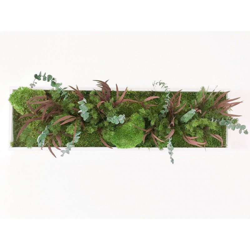 Tableau végétal stabilisé d’intérieur de petit format Haka (du japonais qui signifie rouge) composé par nos paysagistes d’intérieur nécessitant aucun entretien.