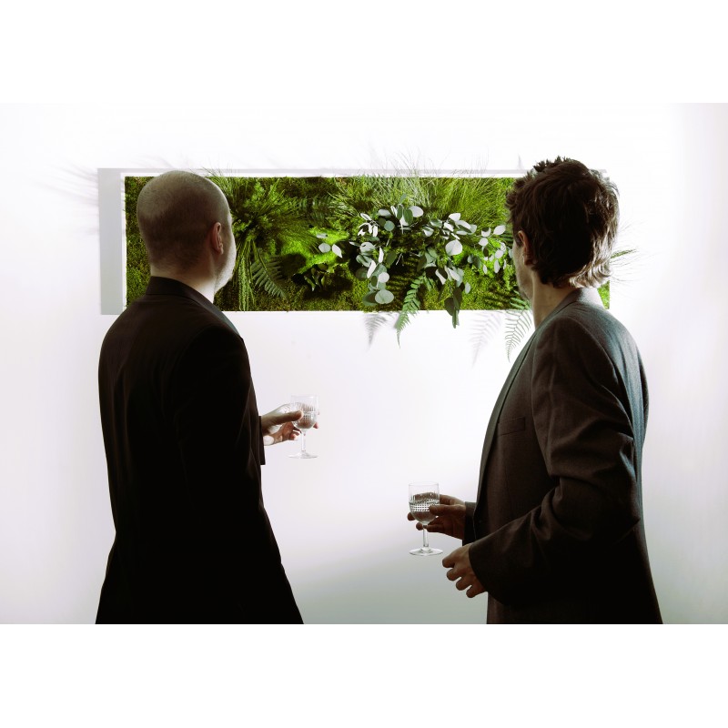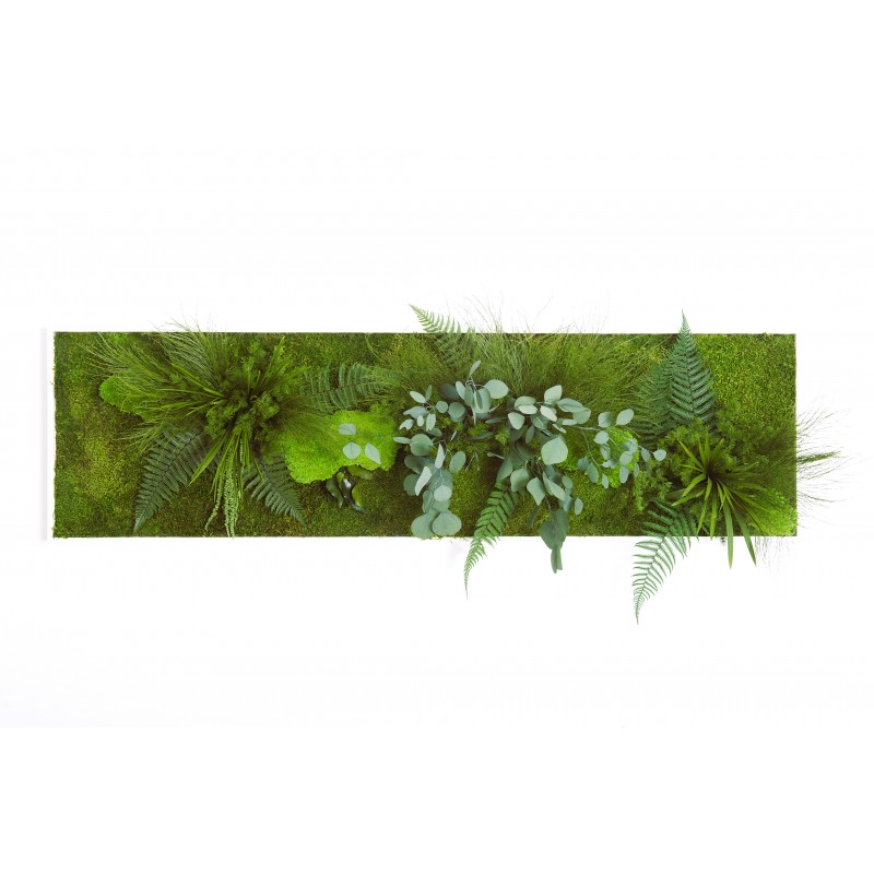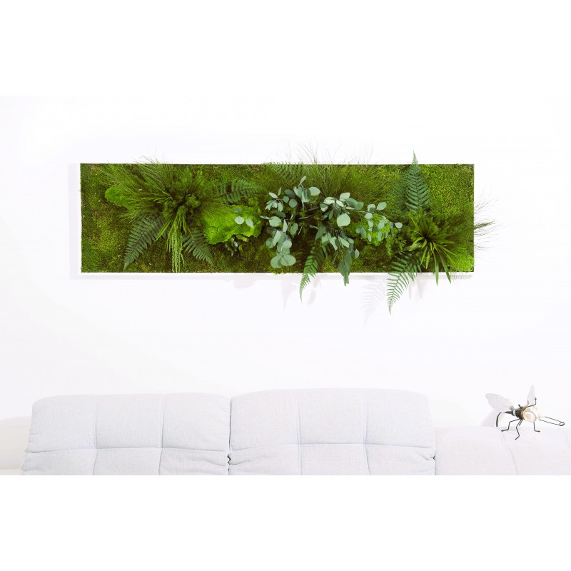 Tableau végétal stabilisé d’intérieur de grand format Midori (du japonais qui signifie verdure) composé par nos paysagistes d’intérieur nécessitant aucun entretien.