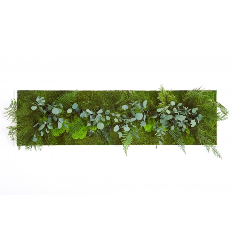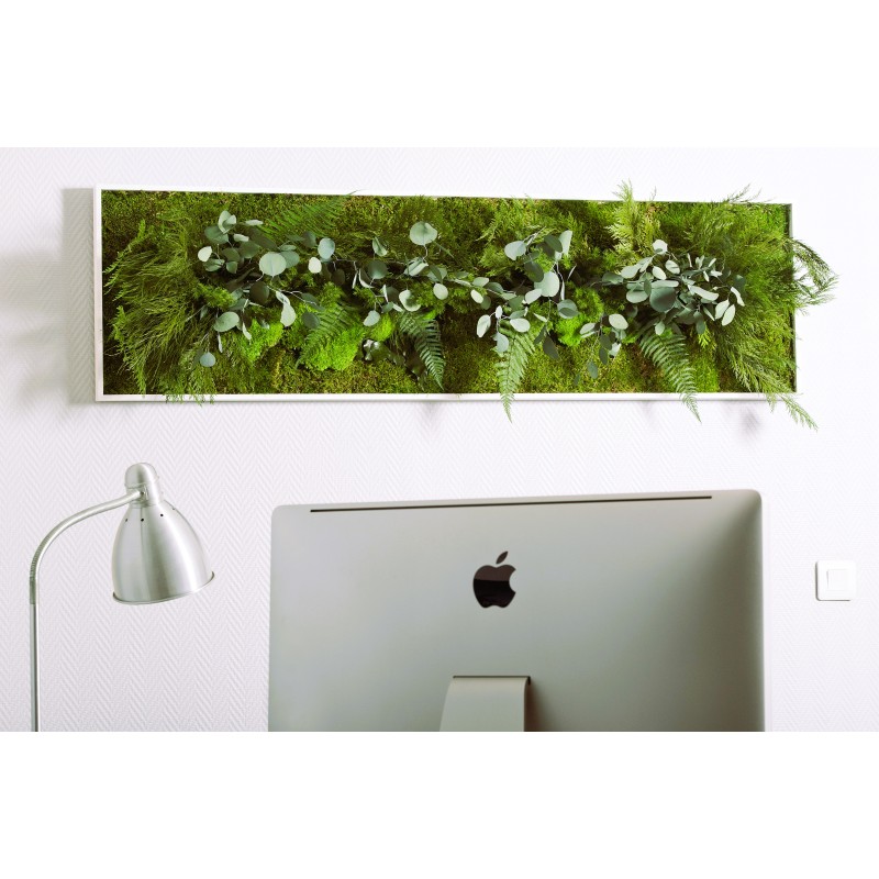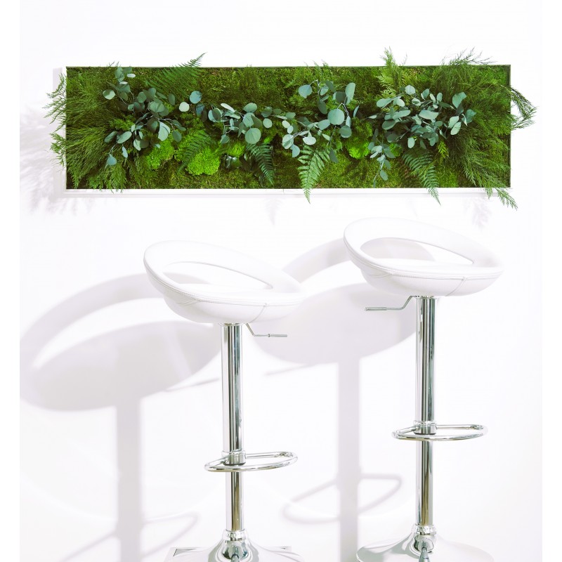 Tableau végétal stabilisé d’intérieur de grand format Yakali XL(du japonais qui signifie eucalyptus) composé par nos paysagistes d’intérieur nécessitant aucun entretien.