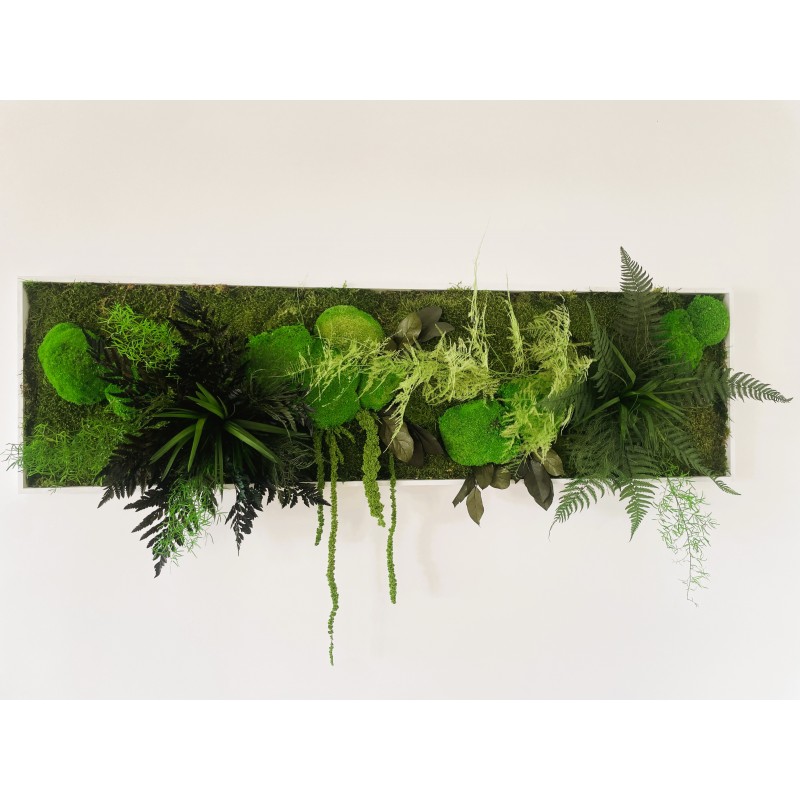 Tableau végétal stabilisé d’intérieur de grand format Kōfuku (du japonais qui signifie bien être) composé par nos paysagistes d’intérieur nécessitant aucun entretien.